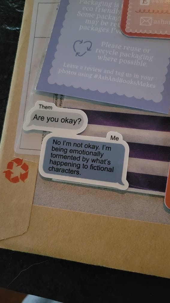 This sticker 1000% sums up the reading experience. Especially if you're a fantasy reader. I feel like all of us at some point or other have sent this message a time or dozen to a friend. Die-cut glossy vinyl sticker.